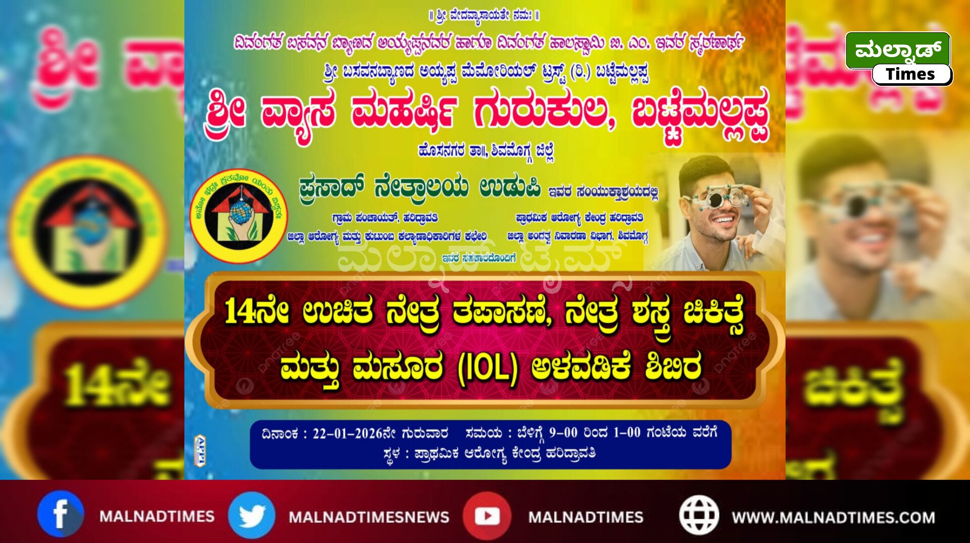 ವ್ಯಾಸ ಮಹರ್ಷಿ ಗುರುಕುಲದಿಂದ ನಾಳೆ 14ನೇ ಉಚಿತ ನೇತ್ರ ತಪಾಸಣೆ, ಮಸೂರ ಅಳವಡಿಕೆ ಶಿಬಿರ