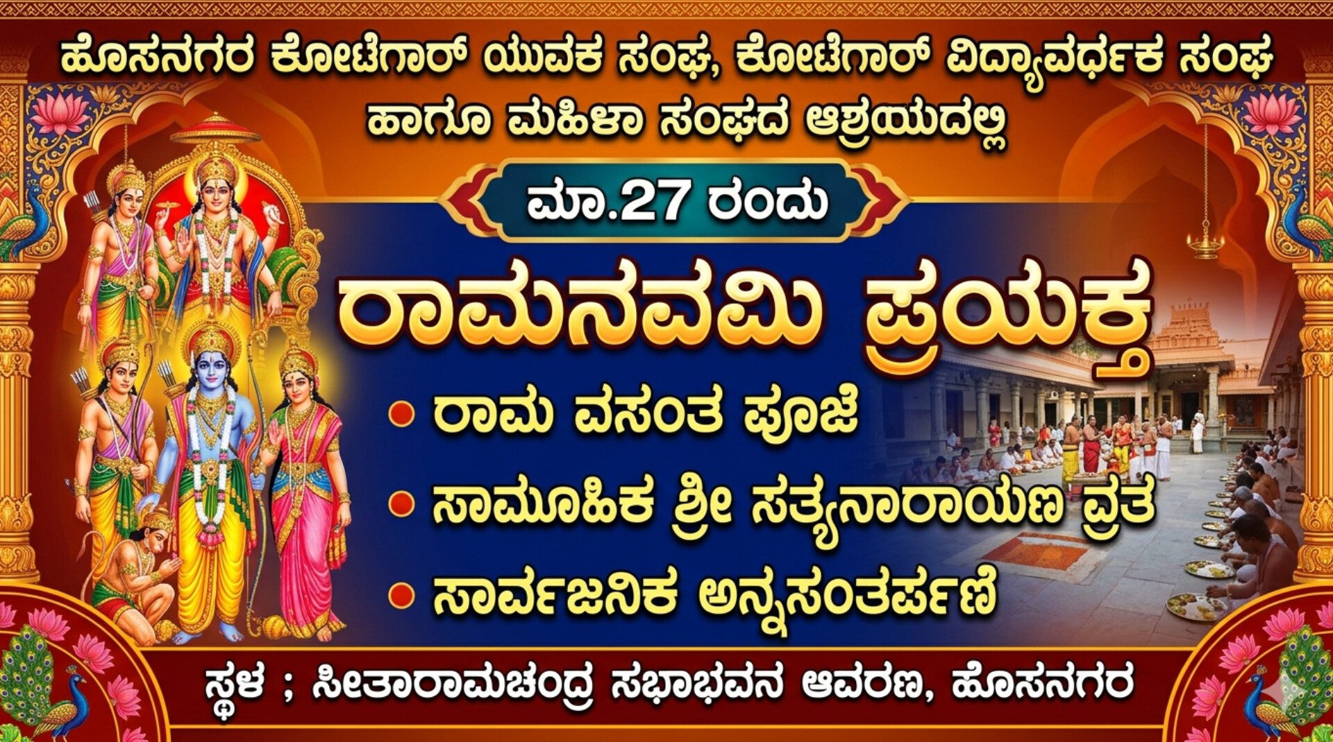ಹೊಸನಗರ ; ಇಲ್ಲಿನ ಕೋಟೆಗಾರ್ ಯುವಕ ಸಂಘ, ಕೋಟೆಗಾರ್ ವಿದ್ಯಾವರ್ಧಕ ಸಂಘ ಹಾಗೂ ಮಹಿಳಾ ಸಂಘದ ಆಶ್ರಯದಲ್ಲಿ ಸೀತಾರಾಮಚಂದ್ರ ಸಭಾಭವನದ ಆವರಣದಲ್ಲಿ ರಾಮನವಮಿಯ ಪ್ರಯುಕ್ತ ರಾಮ ವಸಂತ ಪೂಜೆ, ಸಾಮೂಹಿಕ ಶ್ರೀ ಸತ್ಯನಾರಾಯಣ ವ್ರತ ಮತ್ತು ಸಾರ್ವಜನಿಕ ಅನ್ನಸಂತರ್ಪಣೆ ಕಾರ್ಯಕ್ರಮವನ್ನು ಏರ್ಪಡಿಸಲಾಗಿದೆ ಎಂದು ಕೋಟೆಗಾರ್ ಯುವಕ ಸಂಘದ ಅಧ್ಯಕ್ಷ ಮಾವಿನಕೊಪ್ಪ ಸತೀಶ್ ತಿಳಿಸಿದ್ದಾರೆ.
