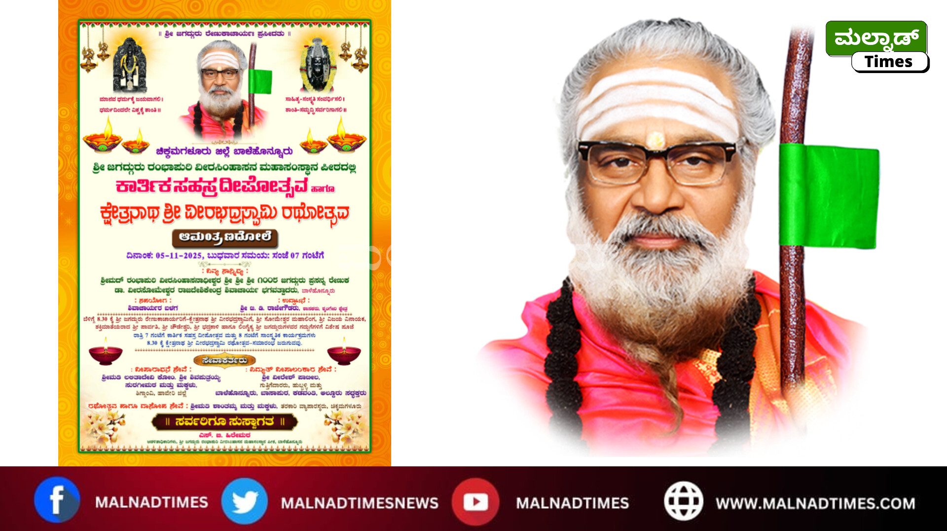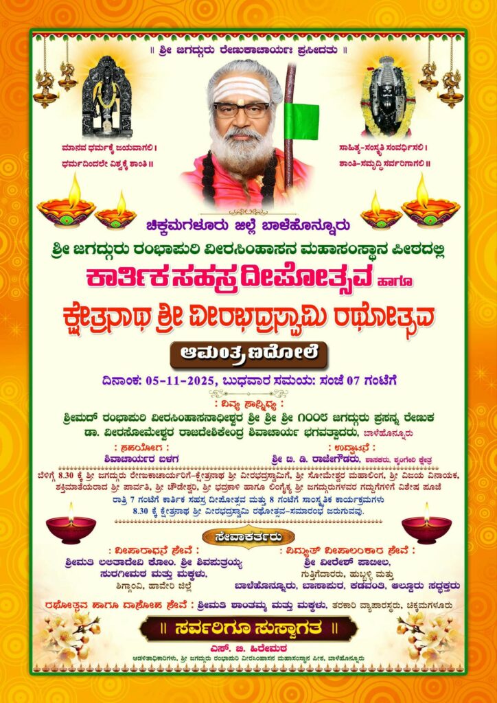 ಕಾರ್ತಿಕ ಸಹಸ್ರ ದೀಪೋತ್ಸವ ಹಾಗೂ ಕ್ಷೇತ್ರನಾಥ ಶ್ರೀ ವೀರಭದ್ರಸ್ವಾಮಿ ರಥೋತ್ಸವ ನ. 5 ರ ಬುಧವಾರ ಸಂಜೆ ಶ್ರೀ ರಂಭಾಪುರಿ ಡಾ.ವೀರಸೋಮೇಶ್ವರ ಜಗದ್ಗುರುಗಳ ಸಾನ್ನಿಧ್ಯದಲ್ಲಿ ಜರುಗುವುದು.