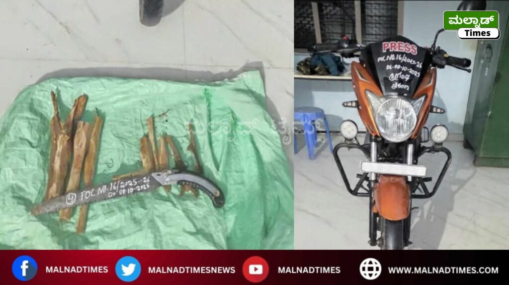 ಅ. 8ರಂದು ಬುಧವಾರ ರಾತ್ರಿ 8 ಗಂಟೆ ಸುಮಾರಿಗೆ ಮೂಡಿಗೆರೆ ಶಾಖೆ ವ್ಯಾಪ್ತಿಯಲ್ಲಿ ಕಾರ್ಯಾಚರಣೆ ನಡೆಸಿದ ಅರಣ್ಯ ಇಲಾಖೆ ಸಿಬ್ಬಂದಿ, ಸುಜುಕಿ ಕಂಪನಿಯ ಬೈಕಿನಿಂದ ಅಕ್ರಮವಾಗಿ ಸಾಗಿಸುತ್ತಿದ್ದ ಶ್ರೀಗಂಧದ ತುಂಡುಗಳನ್ನು ವಶಪಡಿಸಿಕೊಂಡಿದ್ದಾರೆ.